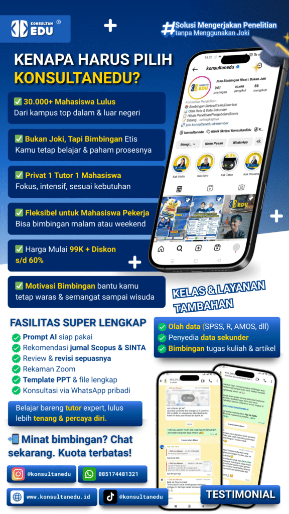 Bagi Kamu yang sedang berada di tengah perjalanan skripsi, tesis, atau disertasi, jangan ragu untuk berdiskusi dengan kami. Konsultasi dapat dilakukan secara privat melalui WhatsApp atau platform online lainnya. Hubungi kami di sini untuk memulai langkah awal menuju penyelesaian tugas akhir yang lebih terarah, efektif, dan bermakna.