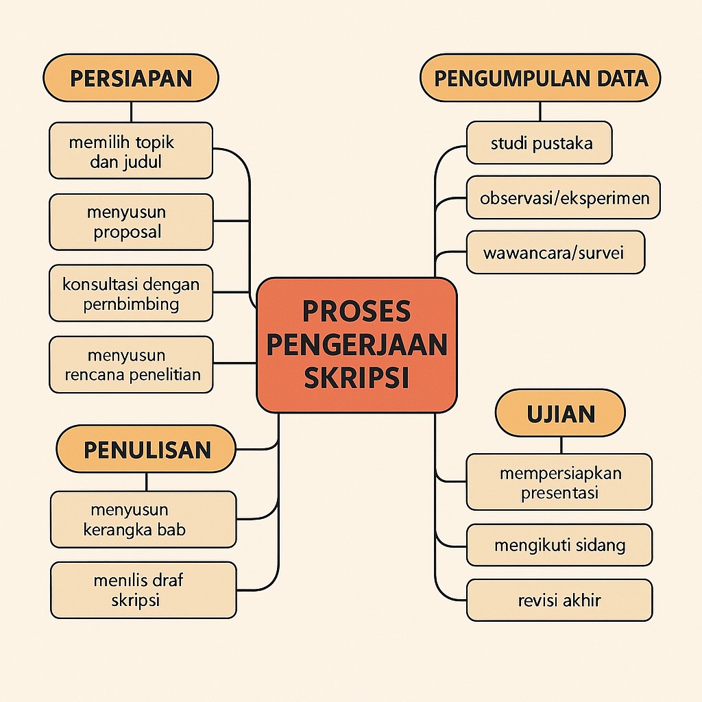 Mindmap merupakan struktur visual yang memudahkan mahasiswa dalam memetakan topik, subbab, dan rincian materi secara menyeluruh. Dengan mindmap, ide-ide yang berserakan dapat diklasifikasikan menjadi kerangka yang lebih terstruktur. Untuk kamu yang ingin tahu lebih jauh bagaimana cara menyusun kerangka skripsi yang baik dalam bentik mindmap, artikel ini akan jadi panduan dasar kamu dalam memahaminya. Artikel ini akan membahas langkah-langkah praktis menyusun kerangka skripsi menggunakan mindmap, contoh aplikasinya, serta tips agar perencanaan bab lebih rapi dan sistematis. Simak sampai selesai!